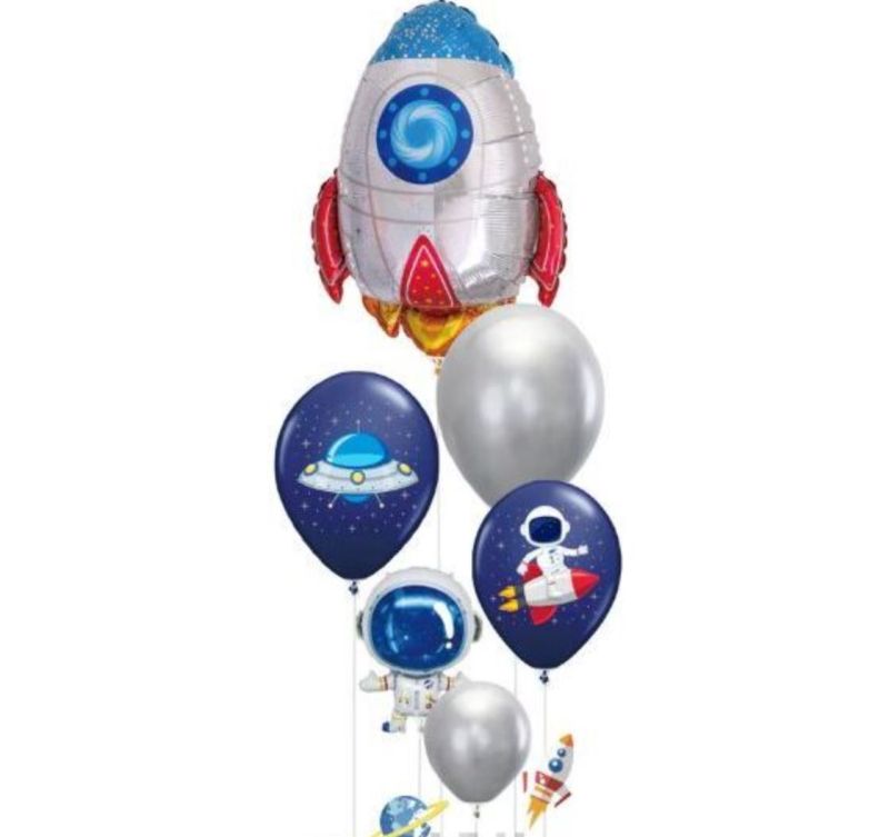 Комплекта включва: 18" фолиев балон във формата на ракета, 10" фолиев балон във формата на астронавт, 2 тъмносини 10" балона с космическа тематика, 1 сребърен 10" балон, 1 сребърен 5" балон и 2 допълнителни елемента на комплекта са хартиена ракета и планета.