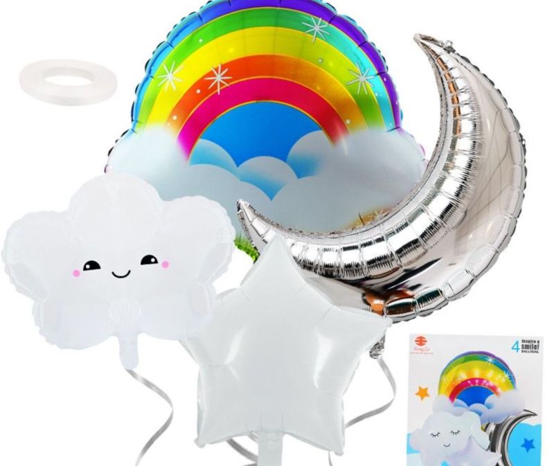 Комплект Балони "Дъга" /4 броя в опаковка - микс/. Високо качество балони от фолио, предназначени за пълнене с въздух или с хелий през клапа, което позволява многократно пълнене с въздух /през сламка или с помпа/. Комплекта съдържа: - връзка - 1 брой балон Дъга фолио - 58 см. х 57 см. - 1 брой балон Луна фолио - 70 см.< /> - 1 брой балон Облак фолио - 48 см. х 45 см.< - 1 брой балон Звезда фолио - 45 см.