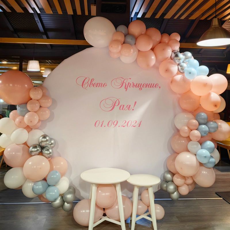 Украса в нежно розово и сребърно подходяща за кръщене, погача, юбилей, абитуриентски бал и други тържества.