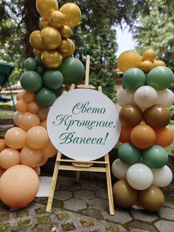 Украса за кръщение, погача или рожден ден със статив с балони и табло с персонализиран надпис.
