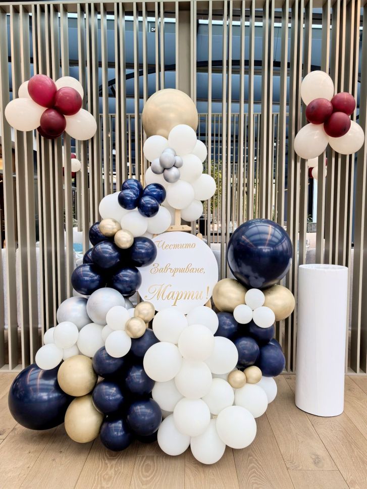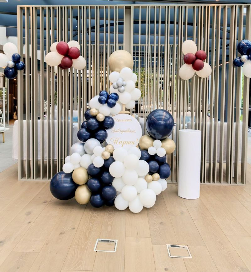 Украса за юбилей, абитуриентски бал или рожден ден със статив и балони