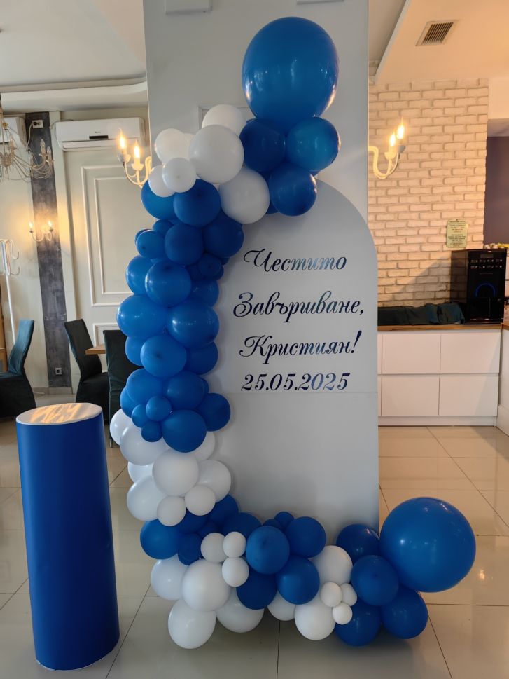 Украса за абитуриентски бал в бяло и синьо