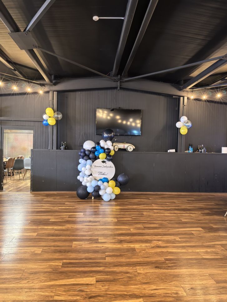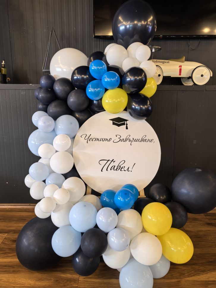 Украса за абитуриентски бал с бяло пано с дизайн по избор.