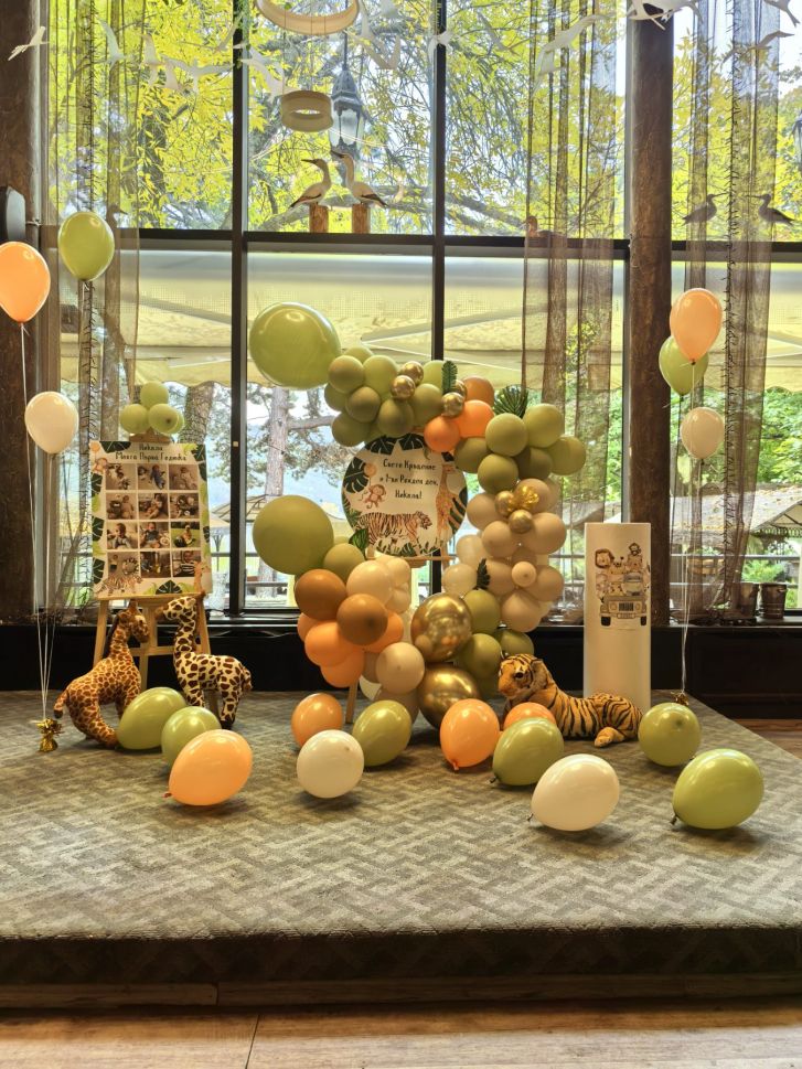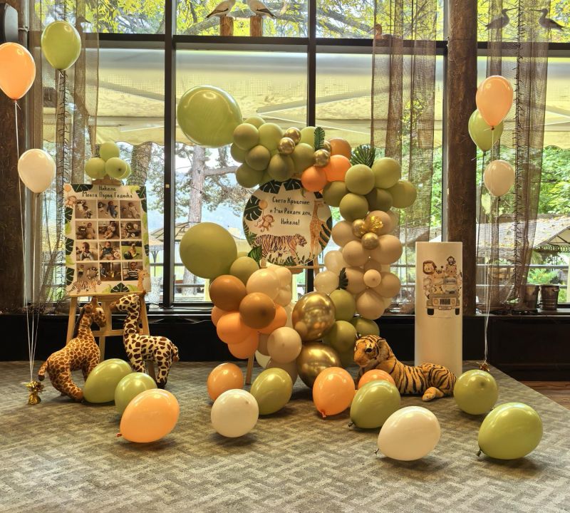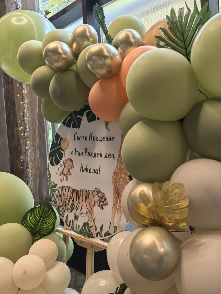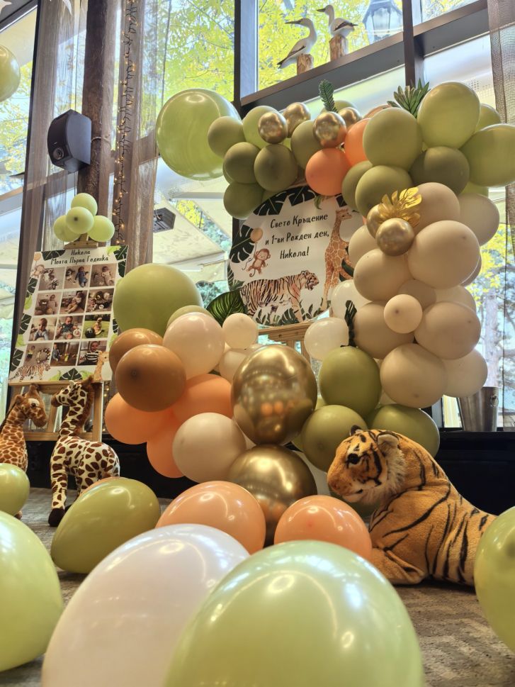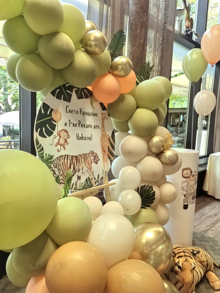 Украса със статив, балони и табло с надпис на тема Джунгла / Сафари подходяща за погача, детски рожден ден и кръщене.