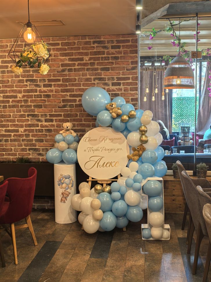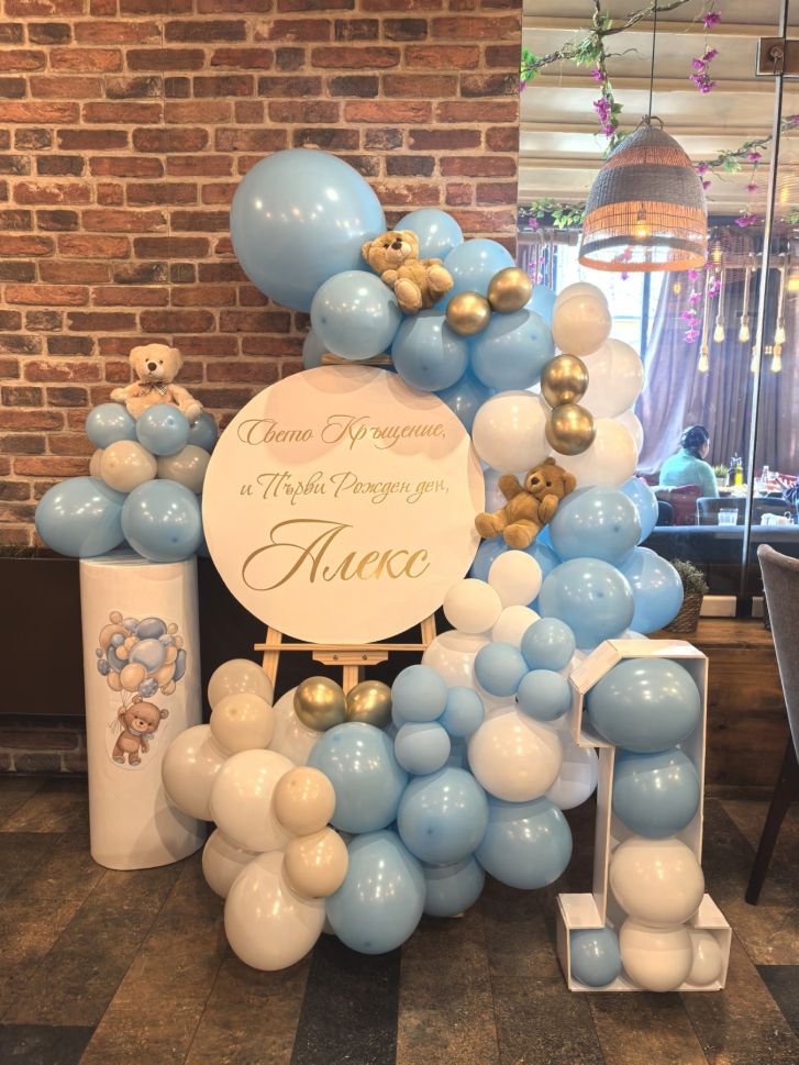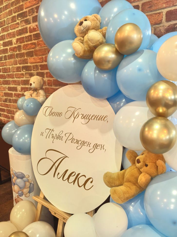 Украса за кръщение, погача или първи рожден ден със статив с балони и табло с персонализиран дизайн и мечета.